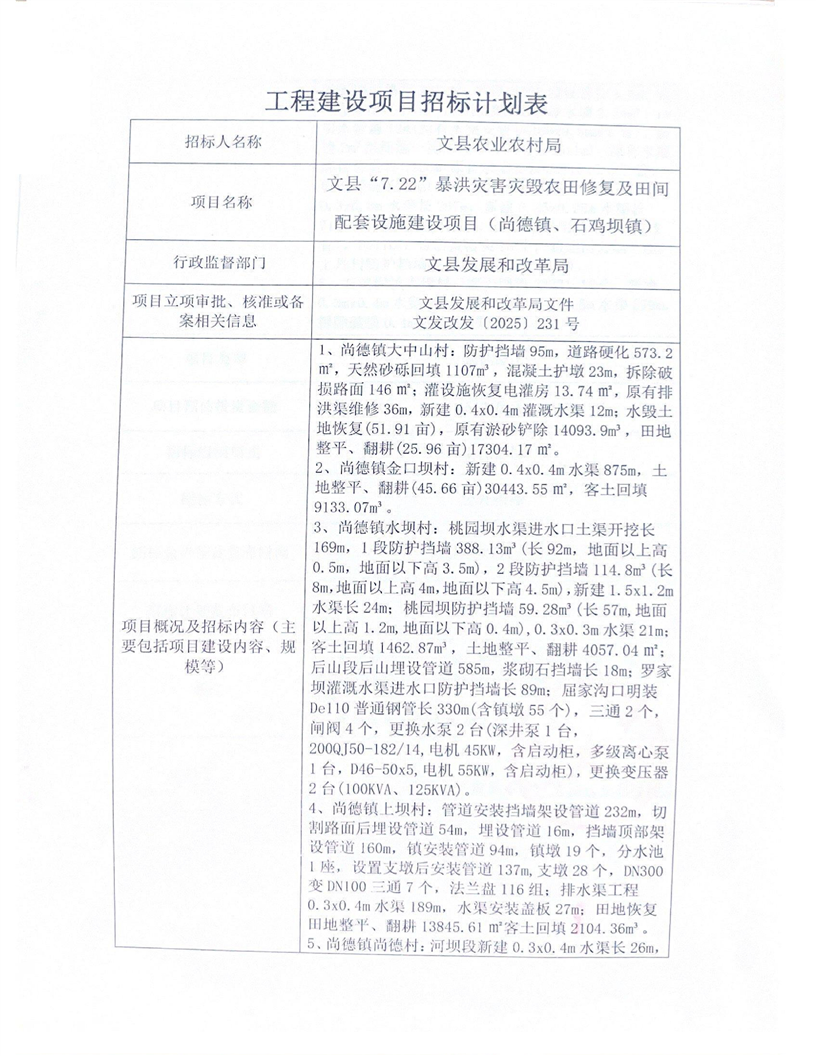文縣“7.22”暴洪災(zāi)害災(zāi)毀農(nóng)田修復(fù)及田間配套設(shè)施建設(shè)項目(尚德鎮(zhèn)、石雞壩鎮(zhèn))