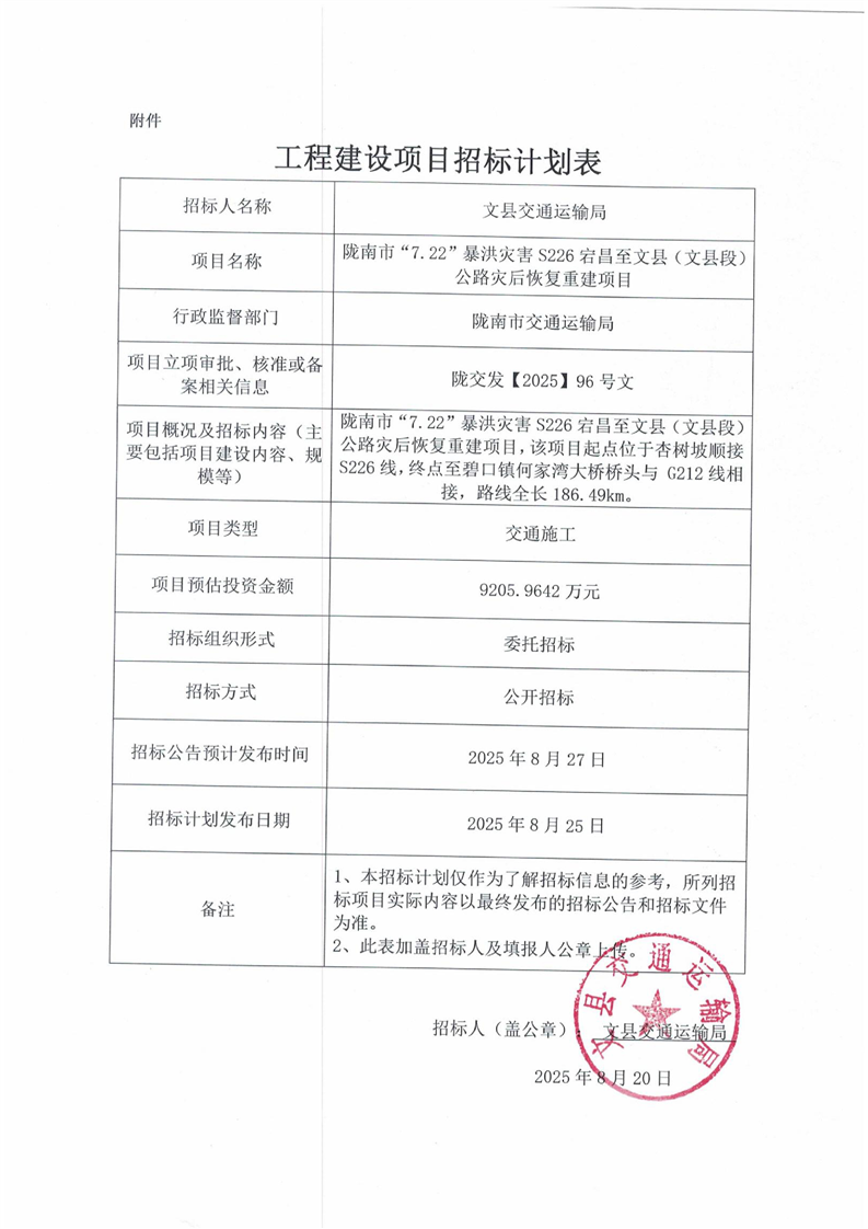 隴南市“7.22”暴洪災(zāi)害S226宕昌至文縣(文縣段)公路災(zāi)后恢復(fù)重建項目