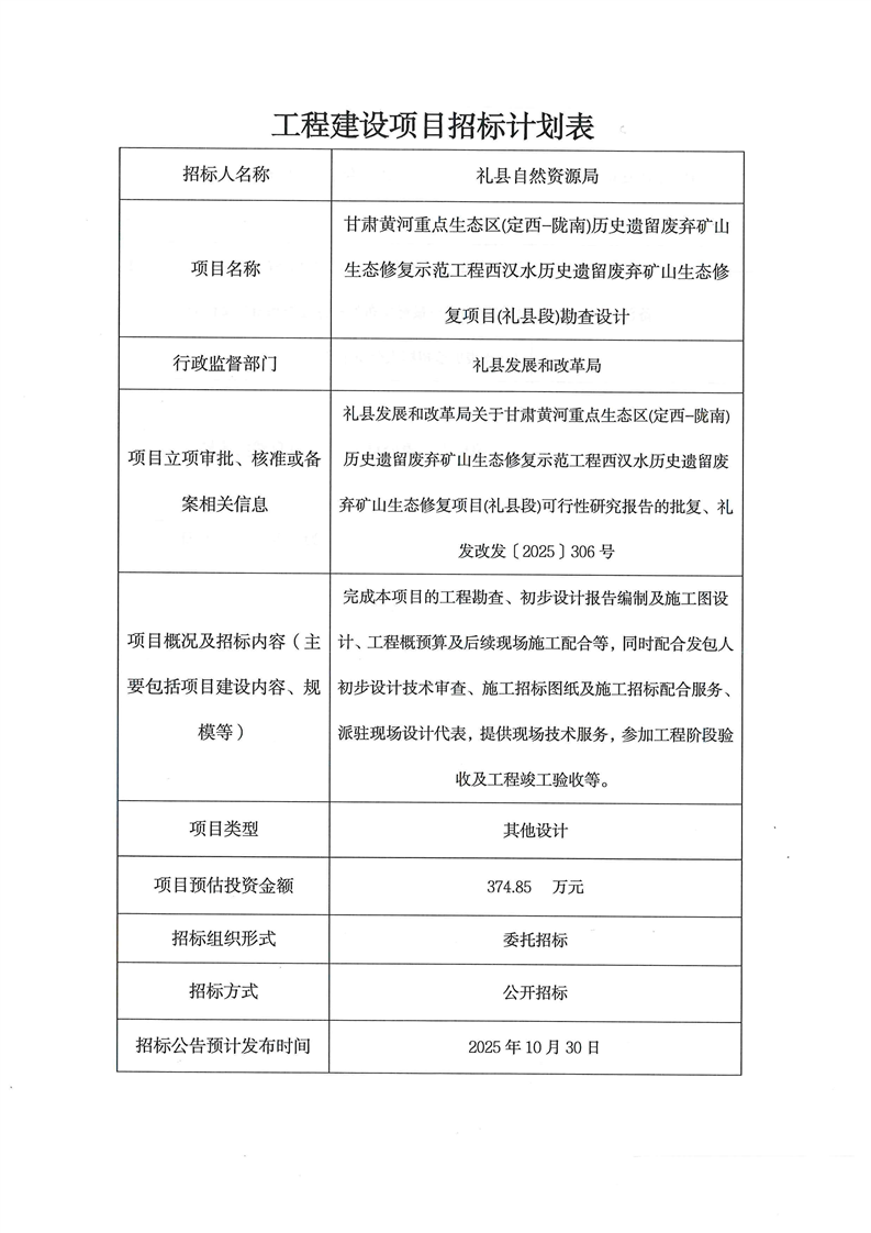 甘肅黃河重點(diǎn)生態(tài)區(qū)(定西-隴南)歷史遺留廢棄礦山生態(tài)修復(fù)示范工程西漢水歷史遺留廢棄礦山生態(tài)修復(fù)項(xiàng)目(禮縣段)勘查設(shè)計(jì)