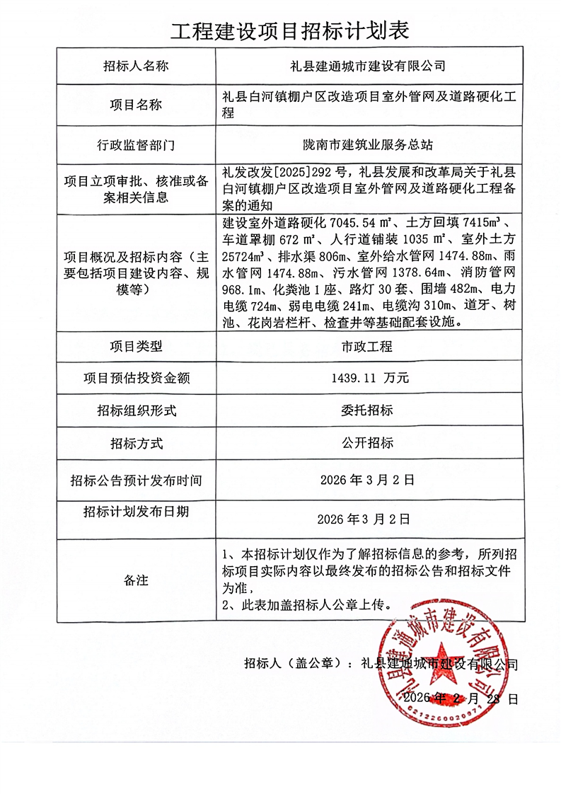 禮縣白河鎮(zhèn)棚戶區(qū)改造項(xiàng)目室外管網(wǎng)及道路硬化工程