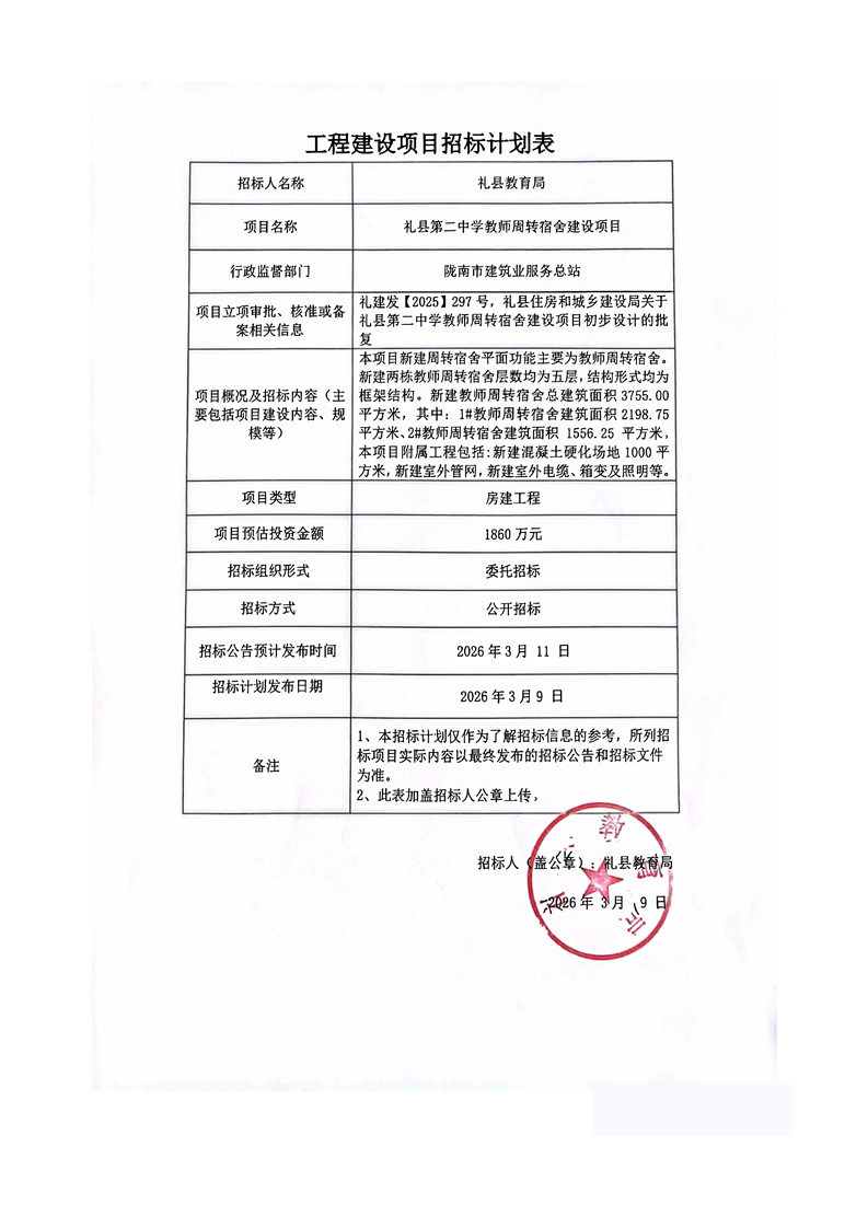 禮縣第二中學教師周轉宿舍建設項目