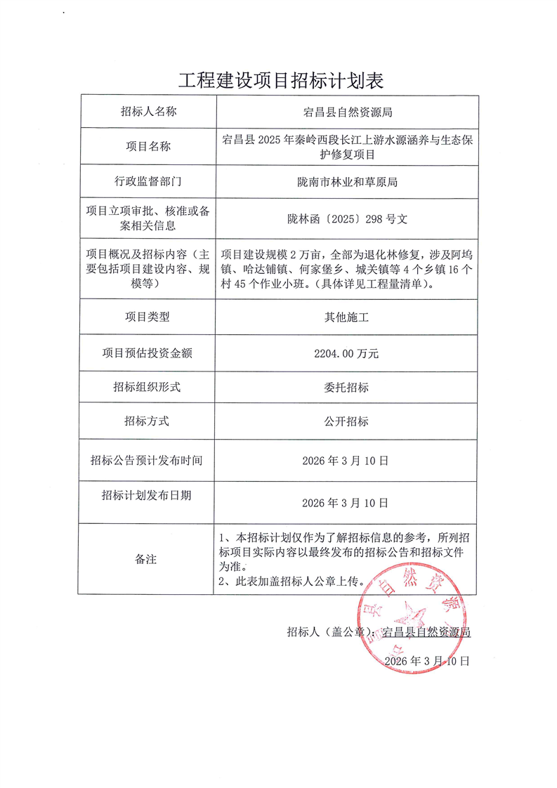 宕昌縣2025年秦嶺西段長(zhǎng)江上游水源涵養(yǎng)與生態(tài)保護(hù)修復(fù)項(xiàng)目