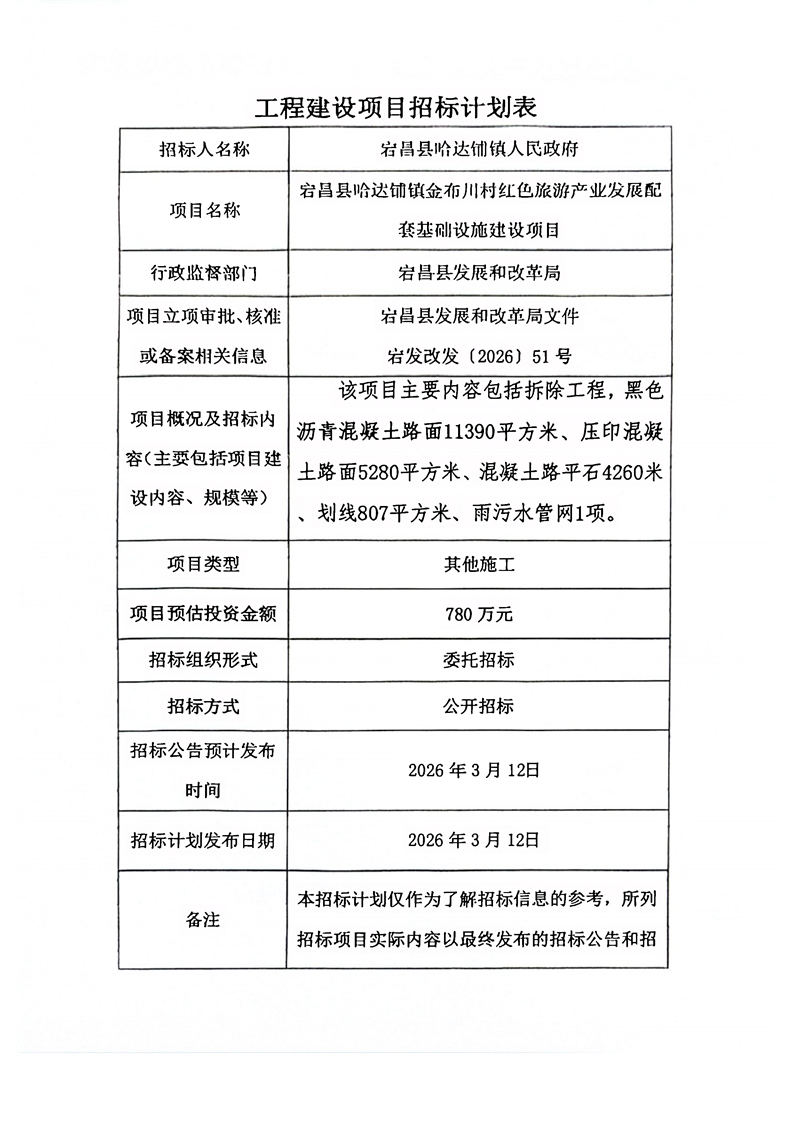 宕昌縣哈達(dá)鋪鎮(zhèn)金布川村紅色旅游產(chǎn)業(yè)發(fā)展配套基礎(chǔ)設(shè)施建設(shè)項(xiàng)目